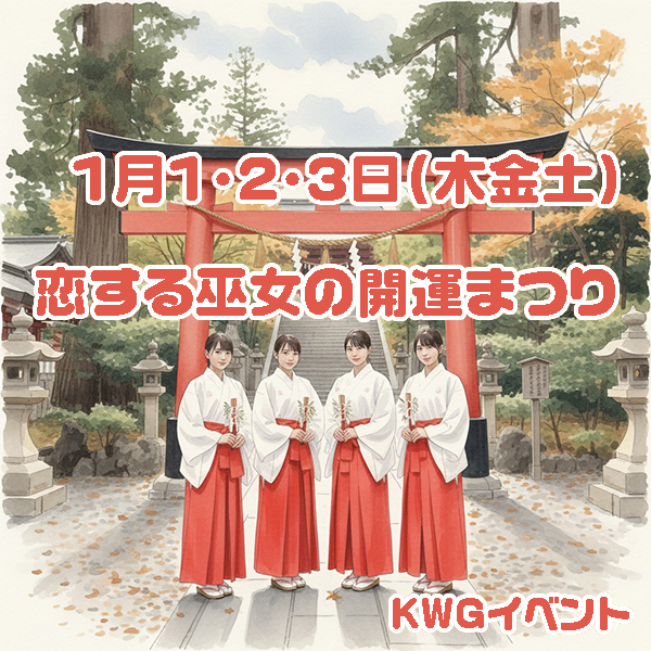 【川越店】1月1・2・3日恋する巫女の開運まつり 2025-12-30 16:11 イベント情報 川越店 イベント詳細1/1・2・3(木・金・土)「恋する巫女の開運まつり」 ⛩️ご帰宅ミッション・おみくじ持参で1P・和装でご帰宅2P ⛩️イベントフード・お餅 ¥550・枡酒 ¥550